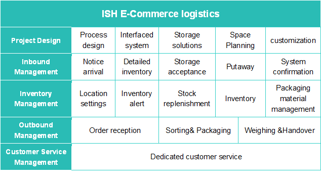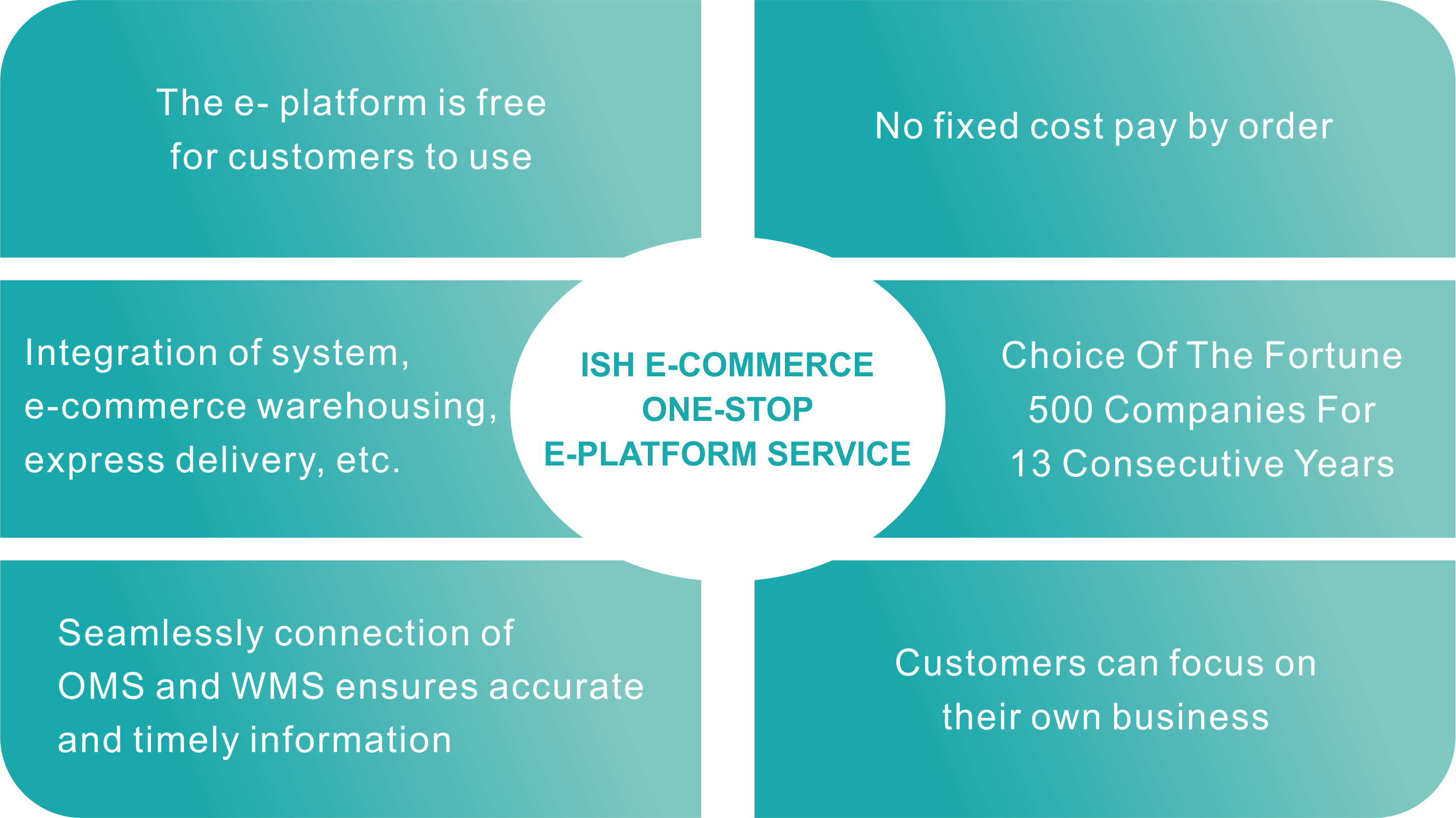 ISH has been operating e-commerce logistics business since 2012. The operating product category covers clothing, shoes and hats, food, books, digital products, cosmetics, auto supplies, etc. ISH can provide customers with wareh e management system, e-commerce order management system and transportation management system, and supports real-time docking with ERP systems and major e-commerce platforms of domestic and foreign customers, so as to realize automatic data transmission and information sharing.